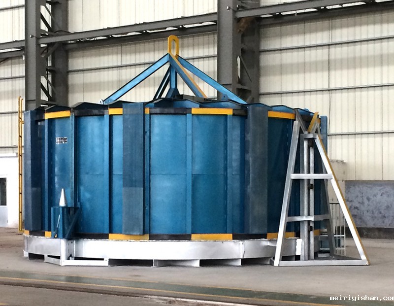 罩式加热炉是一种用于金属材料局部热处理的罩式电加热炉。包括底座、炉体、导风筒、风机,底座上有至少二根导向柱,导风筒沿导向柱安装于底座上,炉体由炉身和炉盖组成,炉身内壁装有加热器,炉体通过密封刀安装于底座的密封槽内,风机固定于炉盖上方,所述底座上开有至少一条通往底座外端的导向槽。其特点是:特别适用于长径比较大、刚性差、而且要求在精加工后进行二次以上热处理的金属零件;无需搬动零件就可以实现空冷,可大大减轻工人的劳动强度;局部热处理区域可调,可充分利用炉膛空间、节约能源。